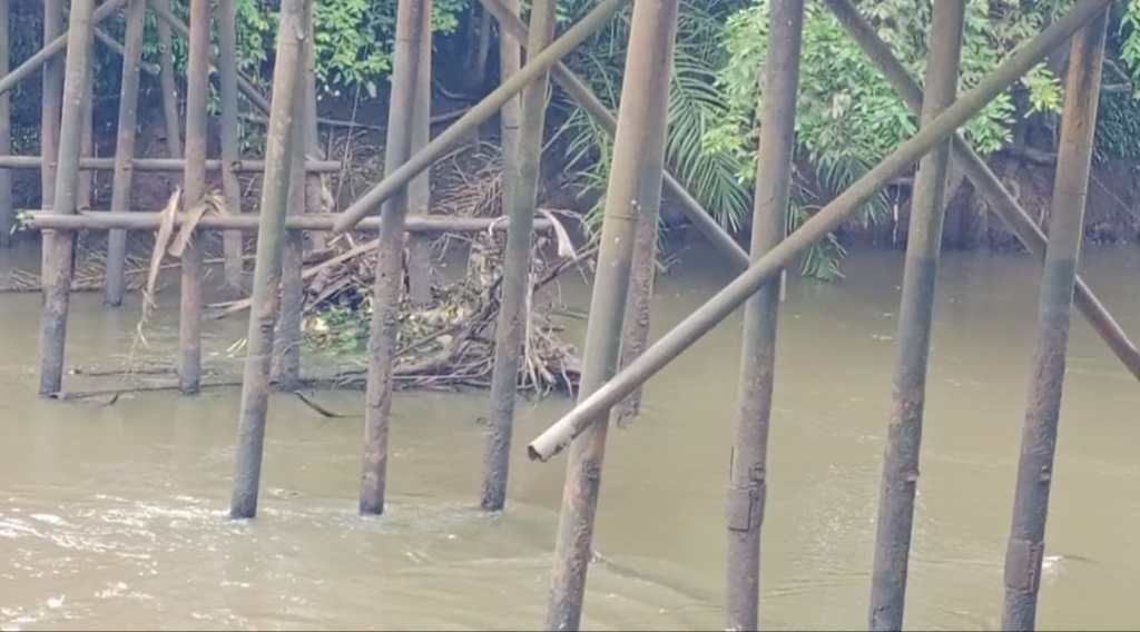Dari pantauan Media RNN dilapangan tampak kaki-kaki atau tiang penyangga yang berada tepat ditengah aliran sungai yang terbuat dari besi bulat beberapa diantaranya sudah tergantung dan sebagian juga sudah keropos karena karat, sehingga kekuatan jembatan yang di topang tiang tersebut hampir tidak berfungsi lagi, mengakibatkan kekuatan jembatan kian mengkawatirkan seakan siap – siap menelan korban bagi yang melintasinya.